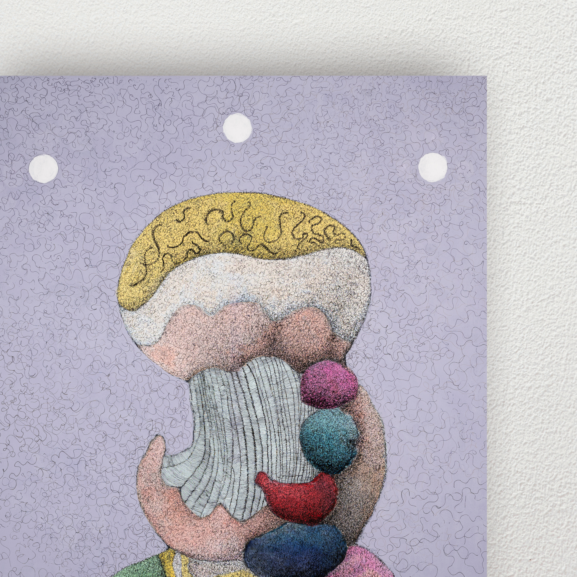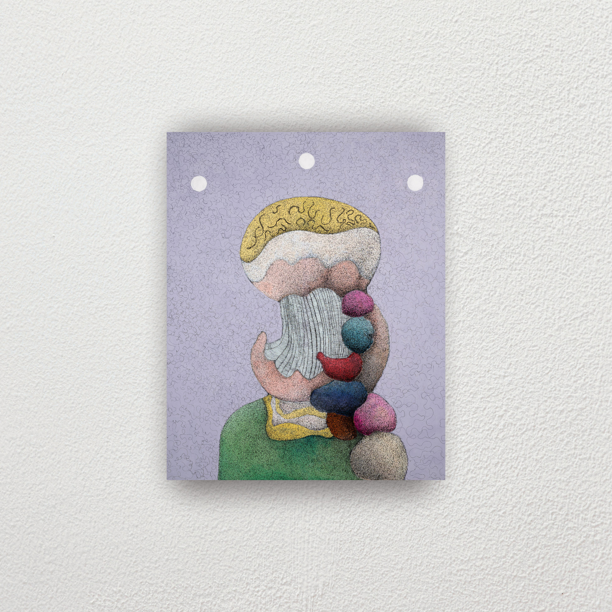 “M9” reveals a layered, biomorphic composition suspended between structure and intuition. Flowing contours and delicate stippling unfold across a soft, atmospheric field, creating a subtle tension between movement and stillness. The muted palette—from violet to ochre—infuses the work with quiet warmth and dreamlike depth. A contemplative statement piece for sophisticated, modern interiors.